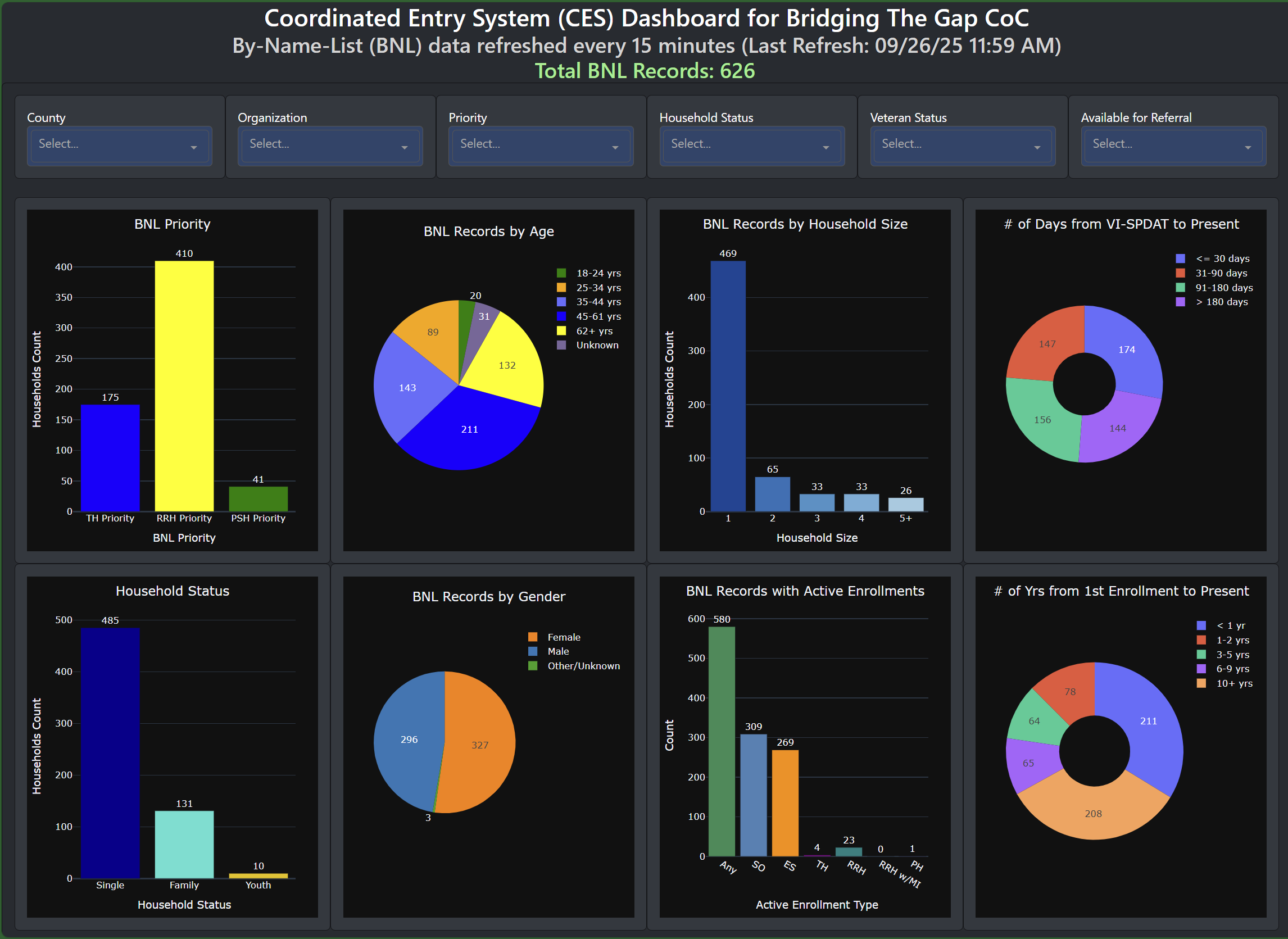Provides summary data highlighting characteristics of households that are active on BTG’s BNL. The data is refreshed every 15 minutes and includes the total number of unique BNL records across all rural counties as basis for the charts shown. BNL characteristics presented in the charts include priority, household status, age, gender, household size, records with active enrollments, and length of time from VI-SPDAT or first enrollment. Data can be used to aid in funding decisions and filtered to help counties and organizations improve CES implementation. The automated HMIS referral process matches BNL records to available housing resources based on BTG’s approved prioritization algorithm.